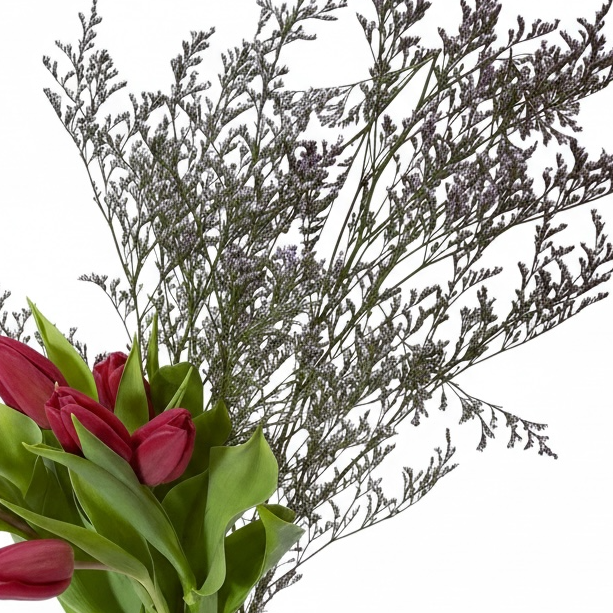 A refined arrangement of 10 fresh tulips gracefully presented in a sleek glass vase, complemented by airy botanical foliage that adds movement and natural elegance.